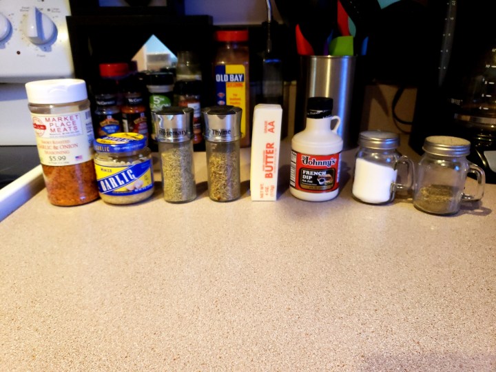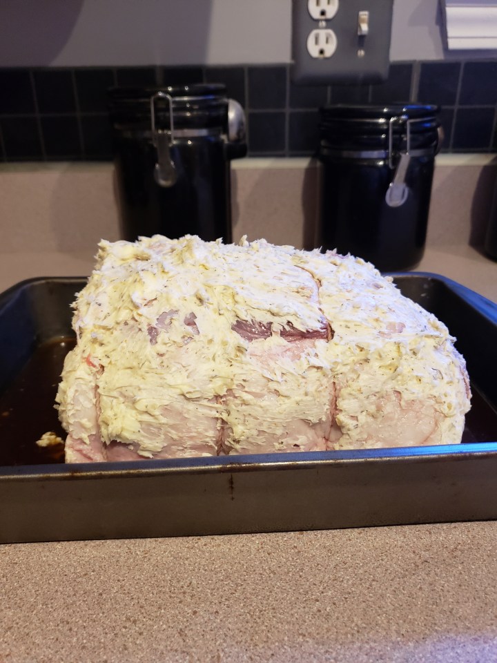 Then rub all spices and butter on roast. Put the roast in a disposable pan with about a cup of water or homemade au jus to keep the roast moist while smoking.