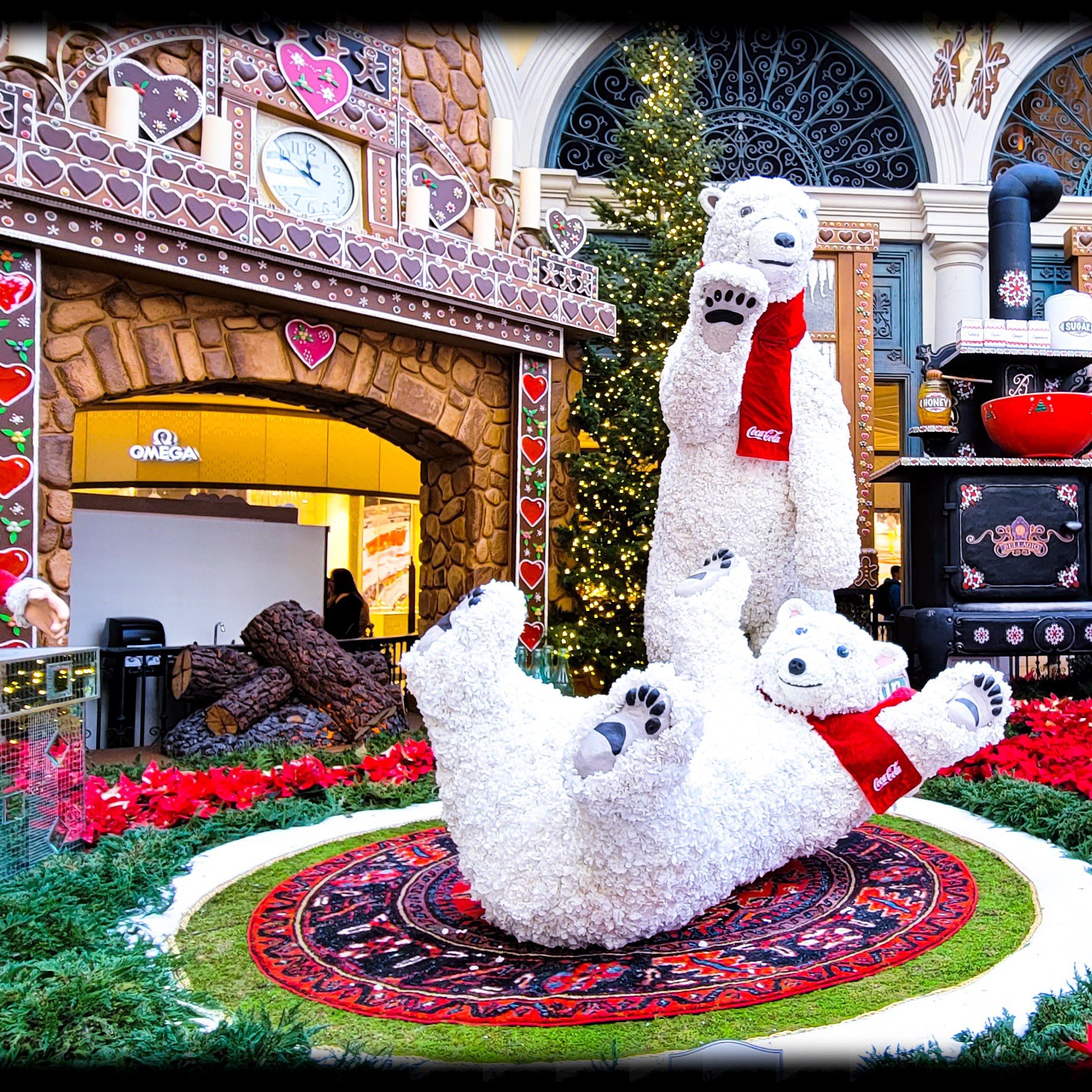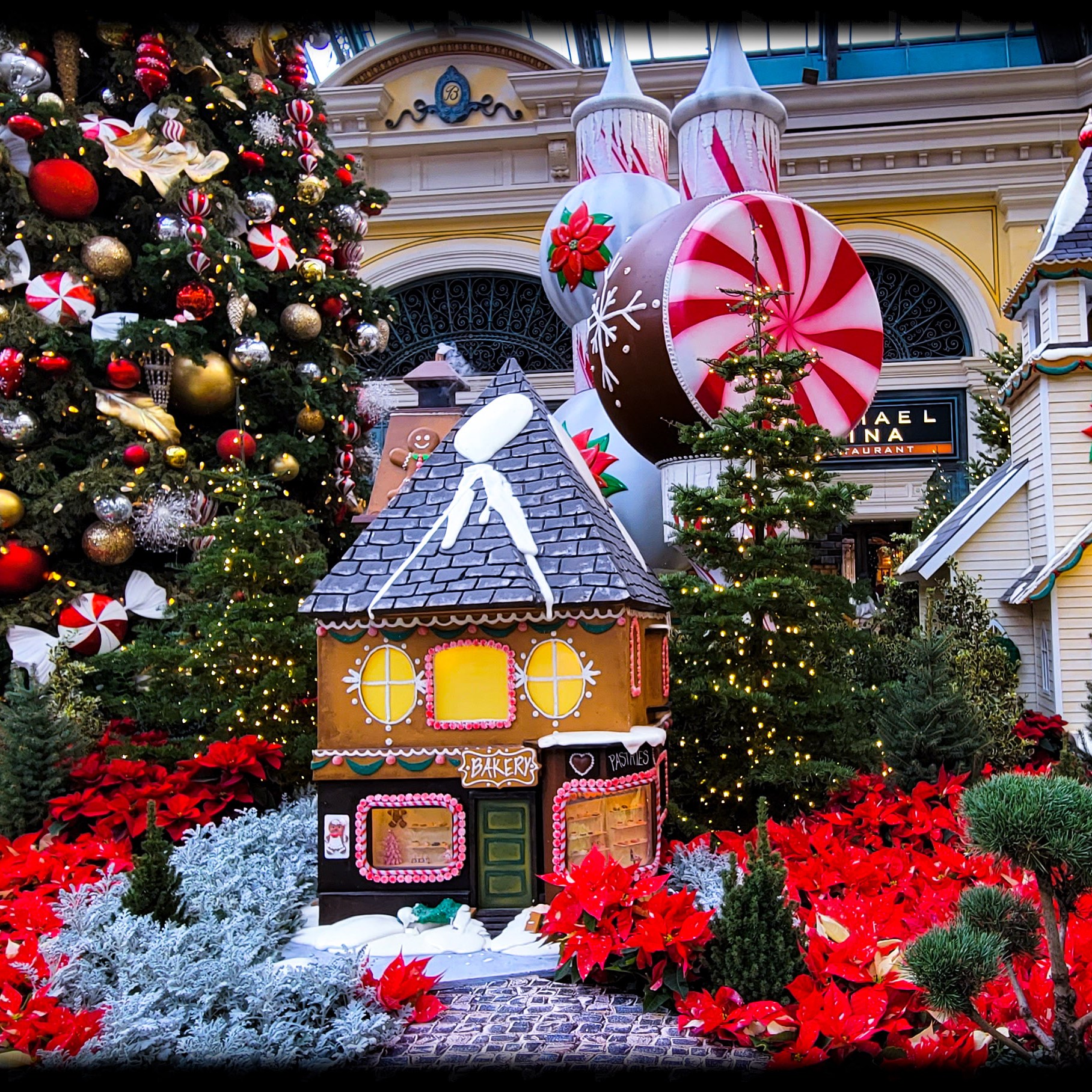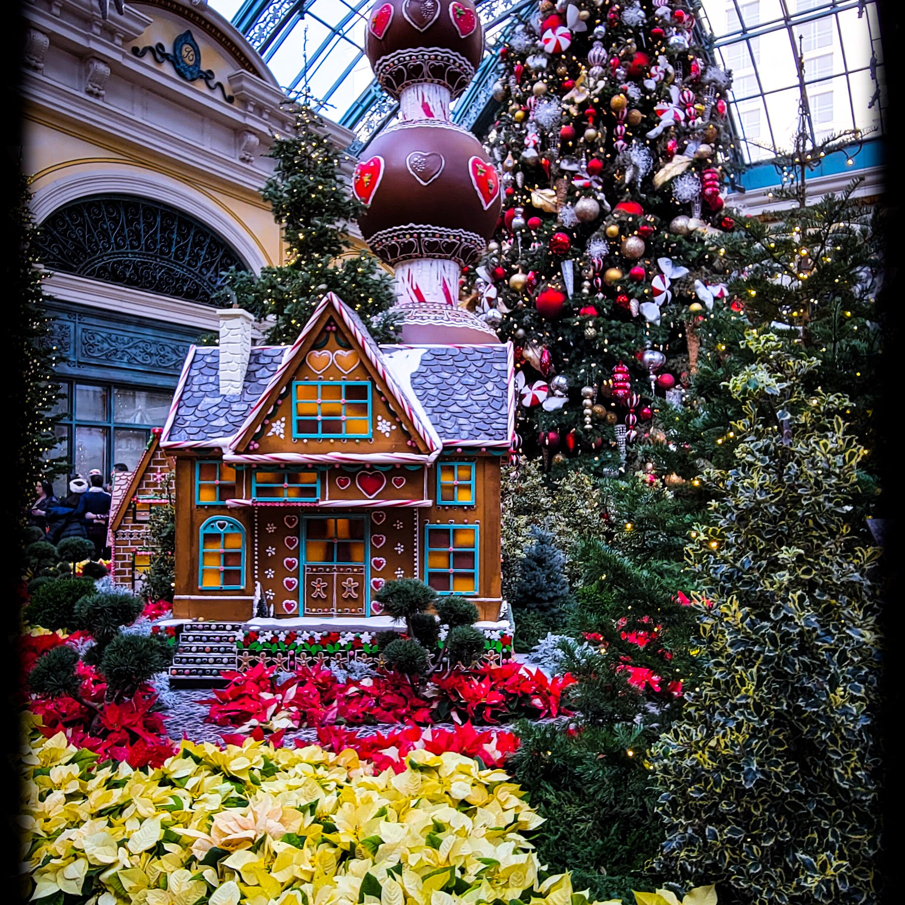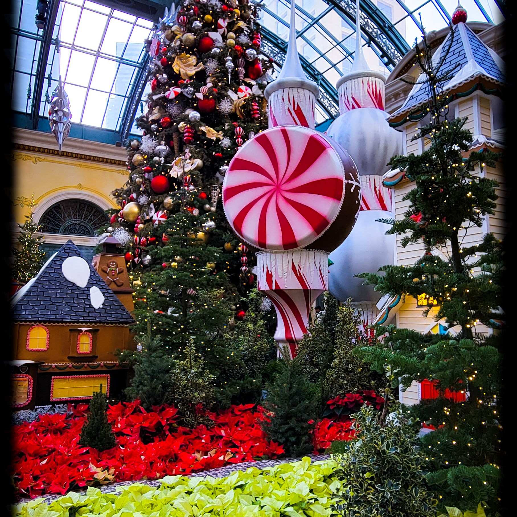 On our first day there we decided to go out and see all the sights, Have some lunch, and enjoy the sunshine outside. Since it was 25 degrees and snowing back in Michigan. The weather was nice for December. It was about 65 -70 degrees the entire time we were there with blue skies and sunny. I just love the weather out west! Our first stop of the day was at the Bellagio, to walk through their botanical garden. It was all set up with a Christmas theme. Such a beautiful place to tour and walk through. Oh, and did i mention it’s free!!! They change the diplay with each season so its always a place i must visit every time i go out there.